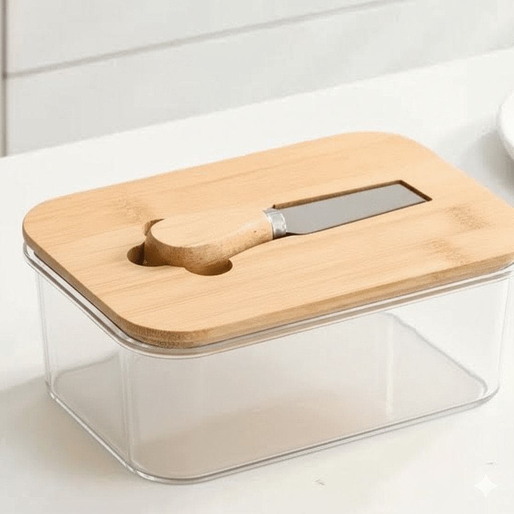 – This is a versatile storage container, as an acrylic butter dish, with a bamboo lid and a dedicated butter knife.