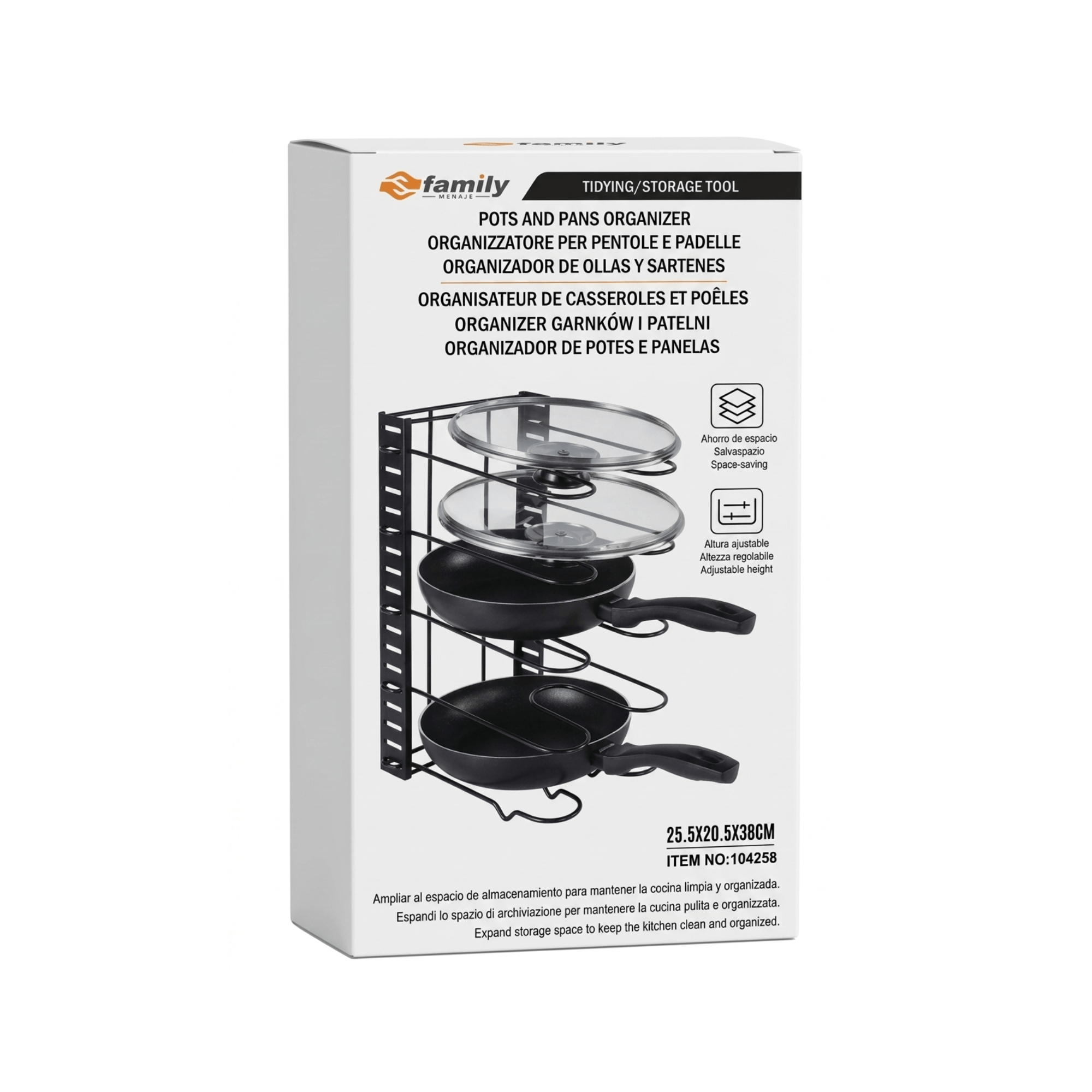 – The Family Menaje Pots and Pans Organizer is the ultimate storage solution designed to bring order to your kitchen chaos.