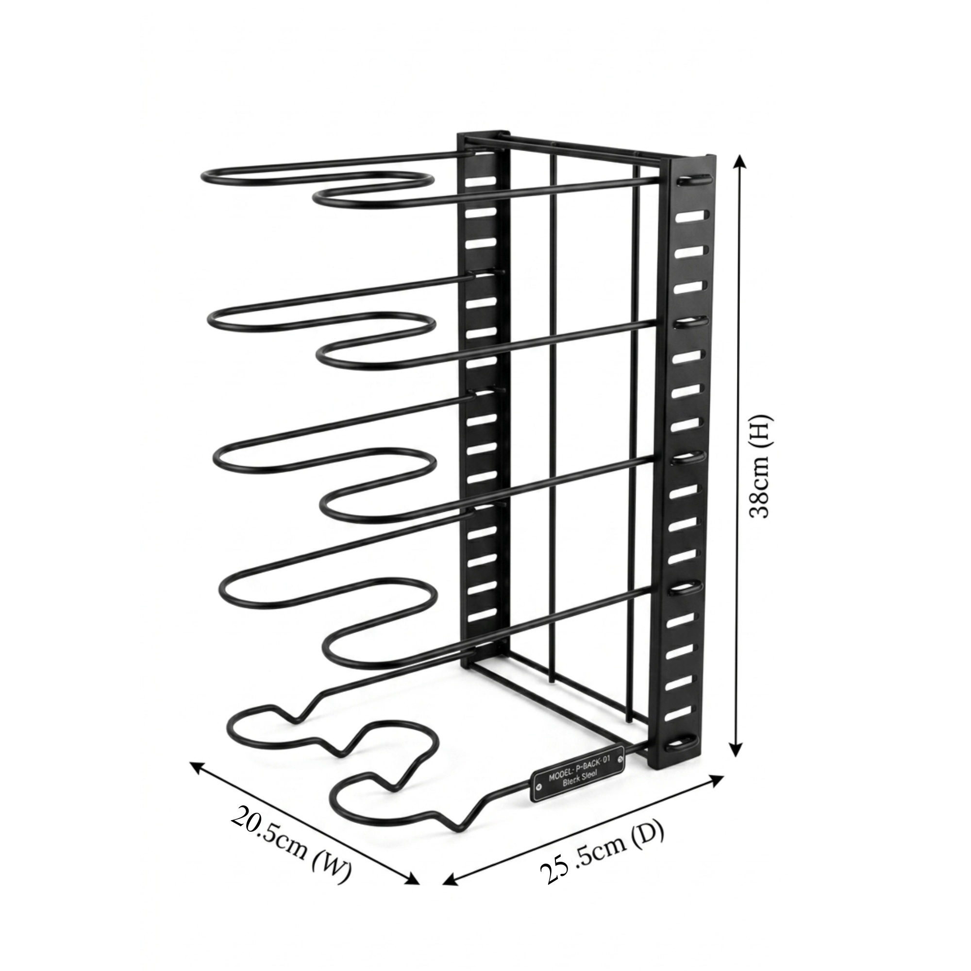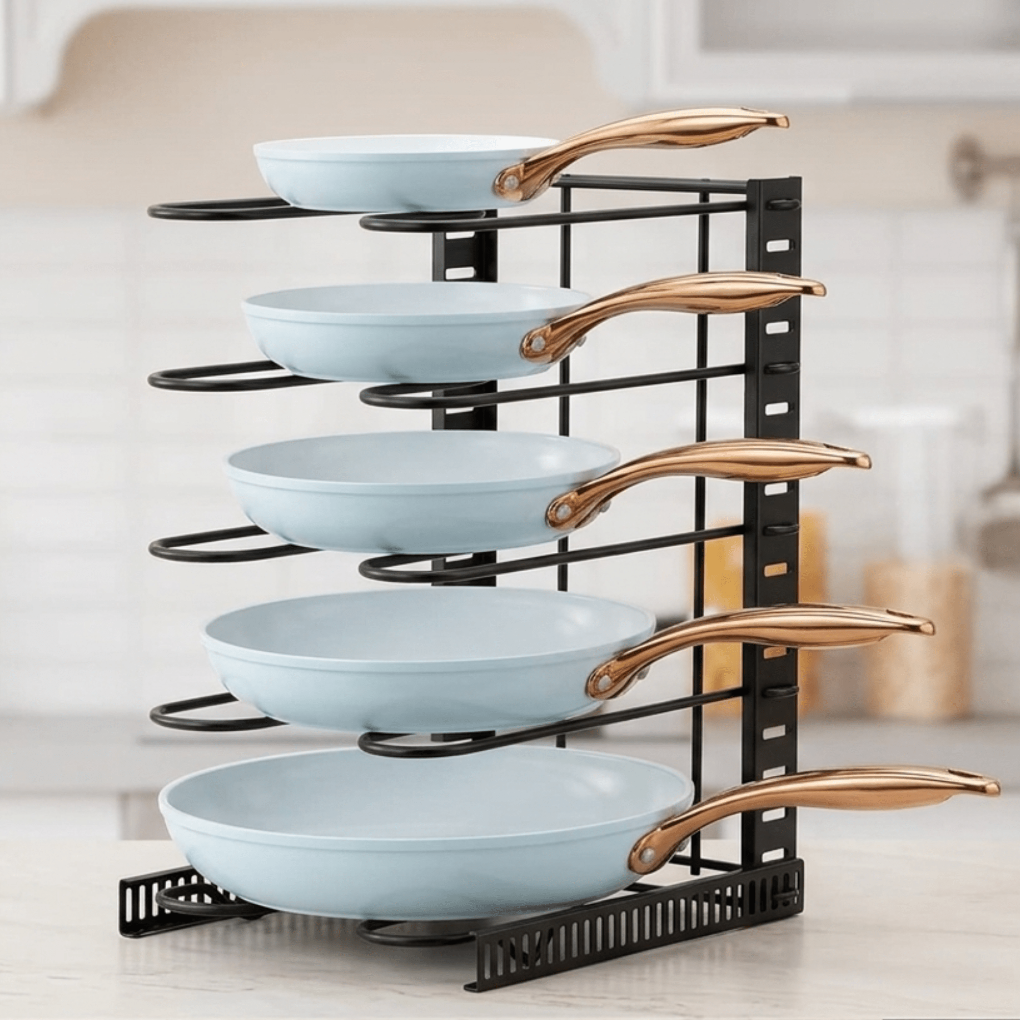 – Crafted from high-quality, powder-coated black metal, this organizer features adjustable tiers that can be customized to fit everything from slim crepe pans to deep stockpots. Whether you place it inside a cupboard, under the sink, or right on your countertop, its sleek and compac frame ensures your cookware stays scratch-free and securely in place.