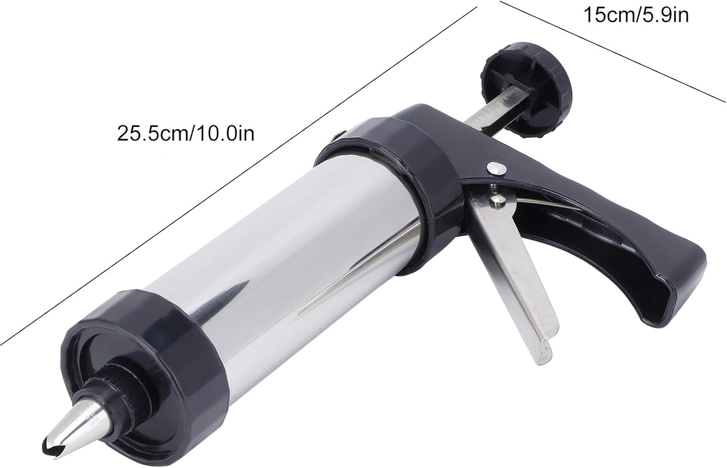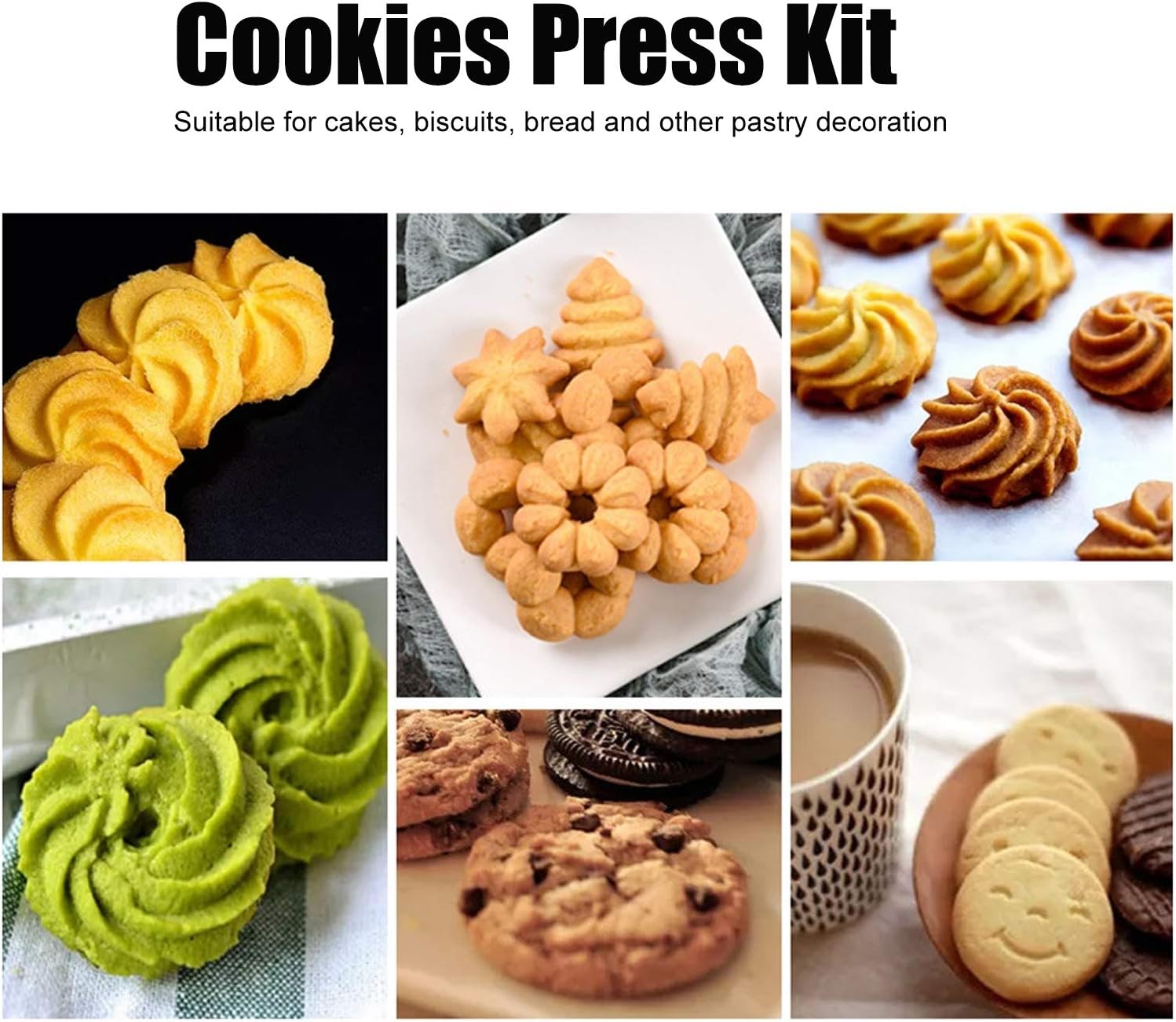 – This kit includes a press “gun” with a spring-loaded plunger, various interchangeable cookie discs with different patterns, and seven icing nozzles. The entire set is designed to simplify the baking process, making it suitable for both beginner and experienced bakers.