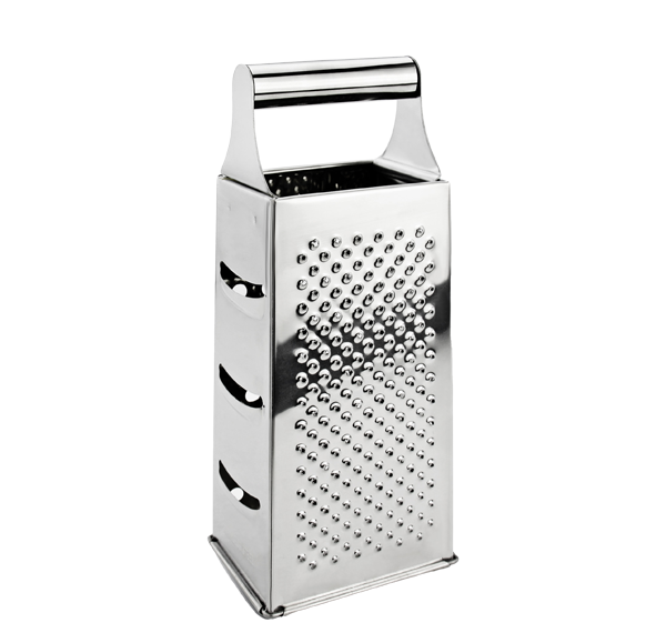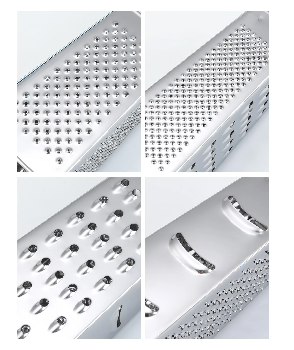 A four-sided stainless steel grater is a versatile kitchen tool, with each side designed for a specific function, including coarse shredding, fine grating/zesting, medium ribbon shredding, and slicing.