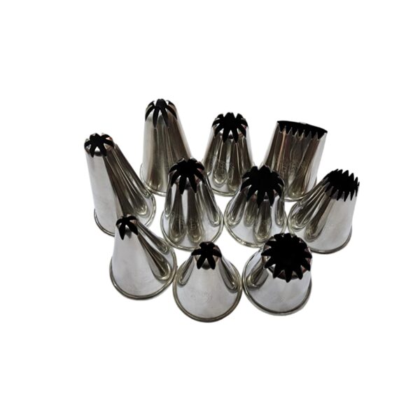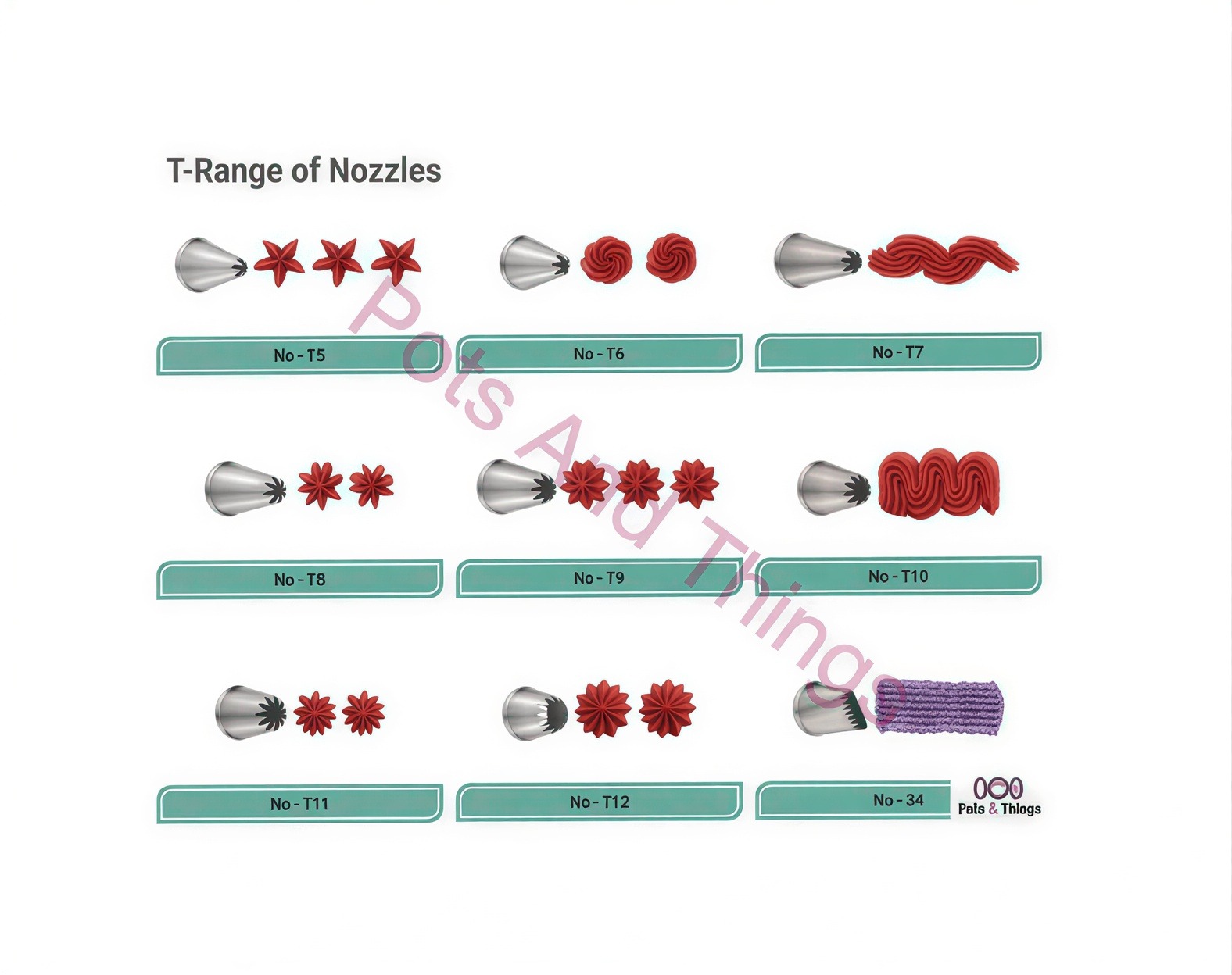 The Noor Icing Nozzle T-Series is a collection of high-quality stainless steel piping tips primarily designed for large-scale floral and decorative patterns. These nozzles are widely used for professional cake decoration.